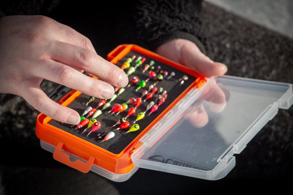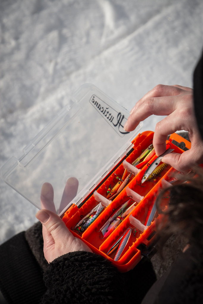 Ena sidan har slitsad foam för säker förvaring av jiggskallar, krokar, flugor och mormyskor, medan den andra har justerbara fack för småbeten och tillbehör. Den klara orangea färgen gör asken enkel att hitta i snö eller terräng.
